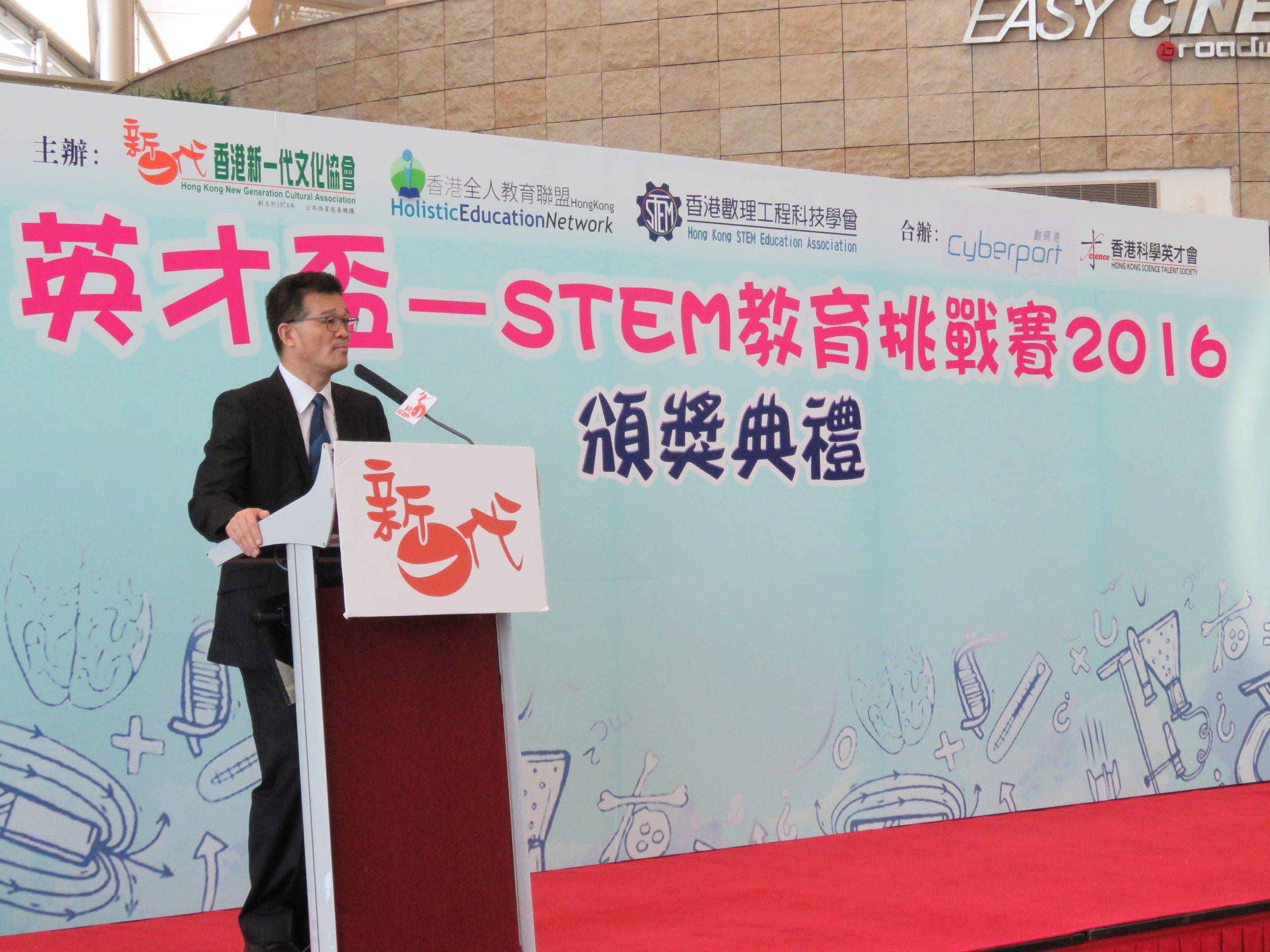 有見及此,為隆重其事,讓社會各界和大眾傳媒進一步了解STEM教育,提升全港學生於STEM方面的興趣,搭建平台供青少年交流學習,推動香港STEM教育發展,本會香港新一代文化協會,與香港數理工程科技學會及香港全人教育聯盟謹定於11月19日下午3:00在數碼港舉行「英才盃—STEM教育挑戰賽2016」頒獎典禮,大賽已邀得教育局常任秘書長黎陳芷娟女士,JP擔任主禮嘉賓,於現場致辭頒獎,勉勵在場師生積極投身STEM教育,教育局將全力支持,為香港培育更多優秀人才。